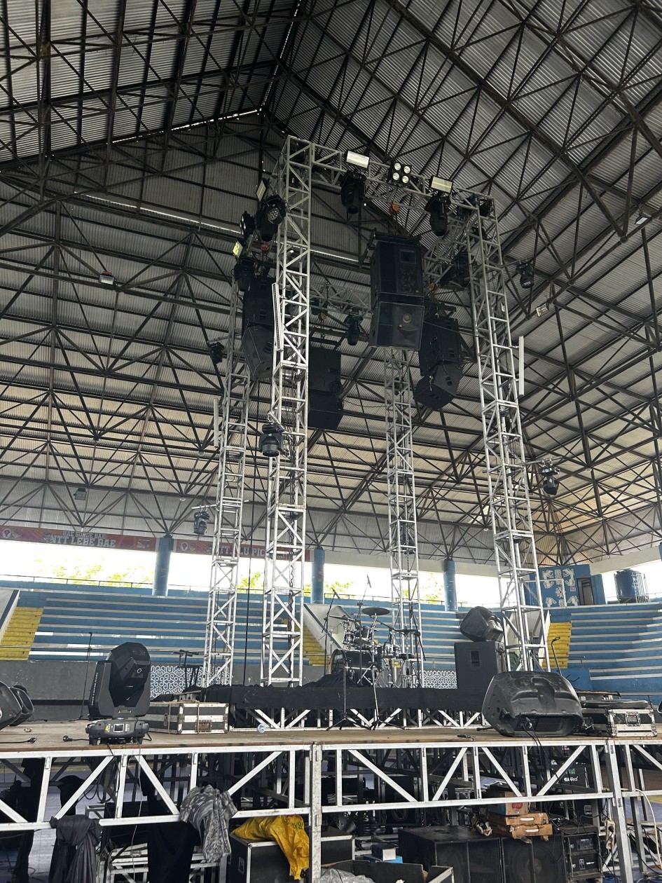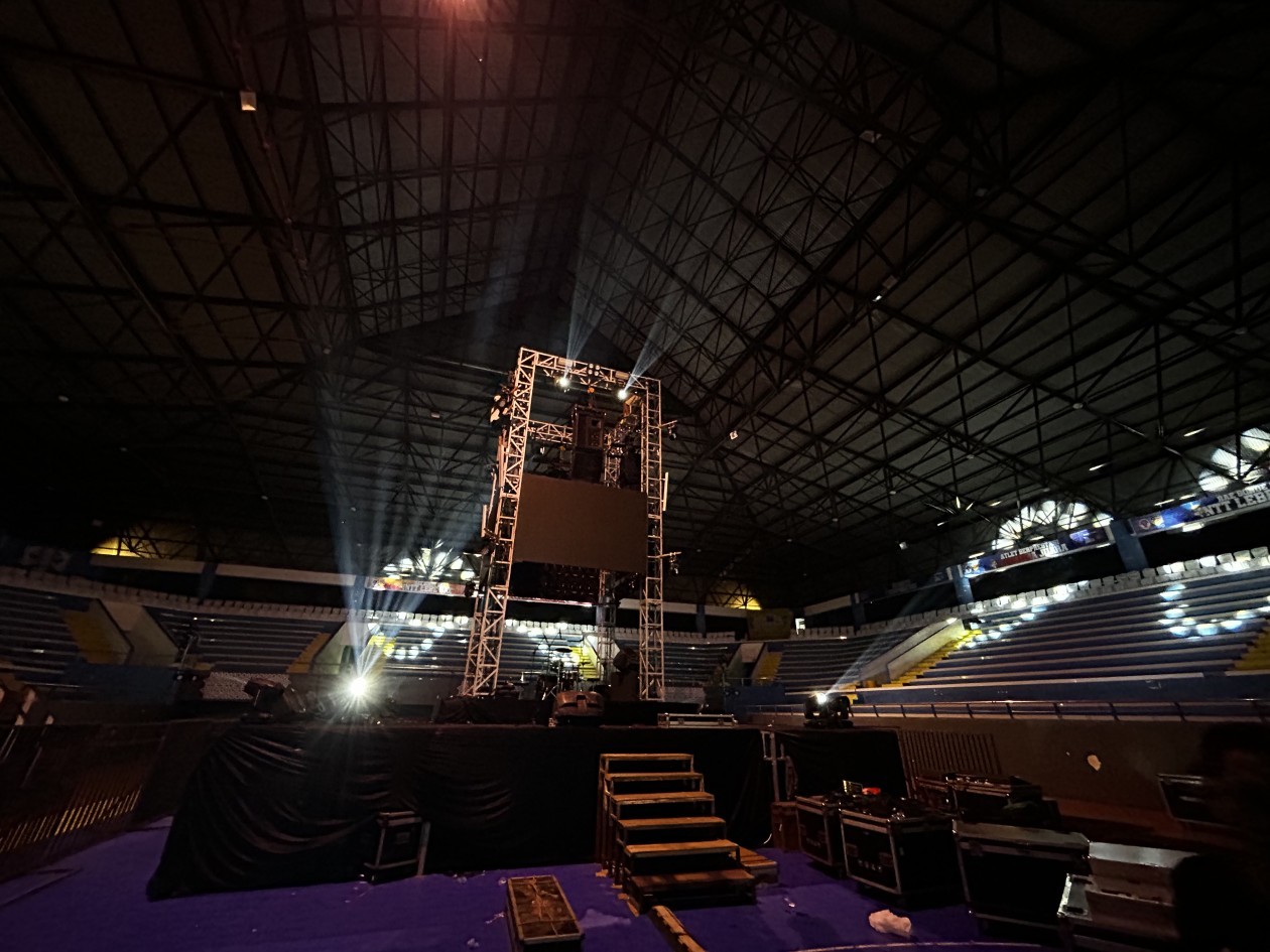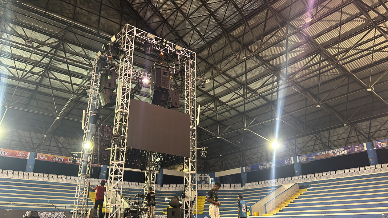 The concert took place at GOR Flobamora, a basketball and futsal court with circular seating. Inspired by the venue’s layout, Mr Andry envisioned a stage positioned at the centre of the court, offering a 360-degree view for the audience. This design ensured an intimate connection between the artists and their fans, but it also posed a significant technical challenge – how to deliver crystal-clear, immersive sound to an audience seated in every direction.