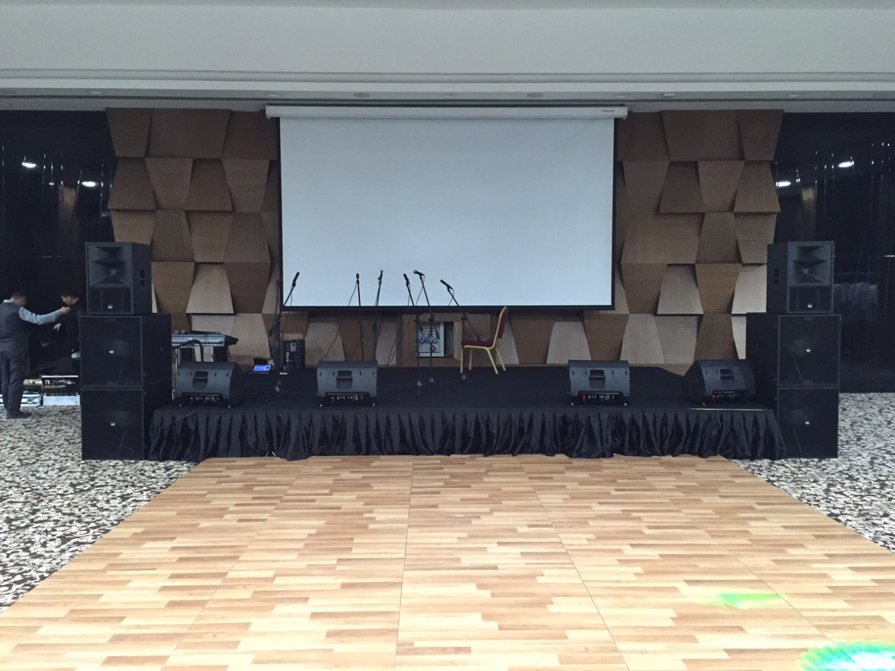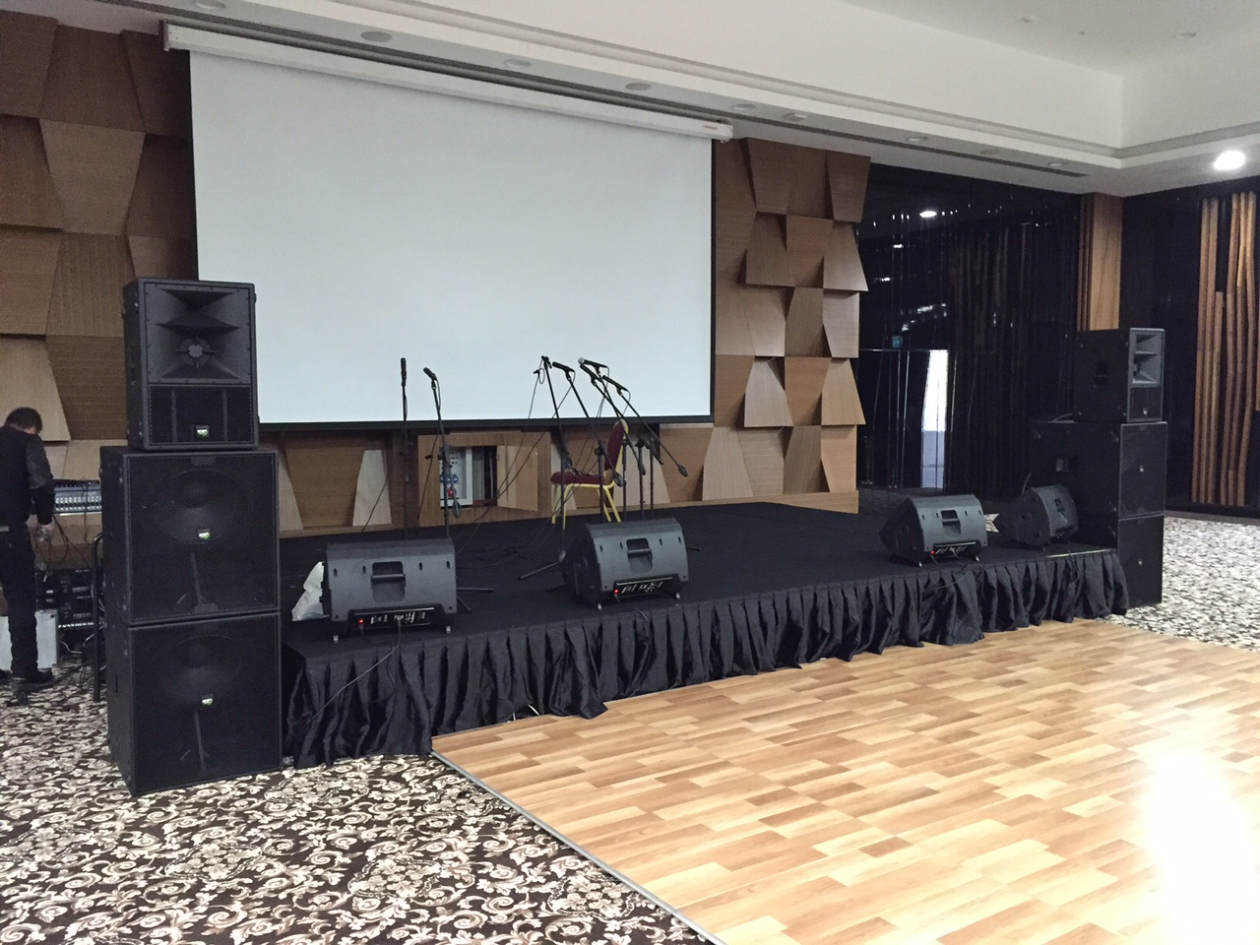 The ballroom measures 690 square metres and is used for a wide variety of applications. The system needed to be able to cater for all types of material – Live music, Dance music and playback. The brief also demanded that the system be powerful and punchy whilst offering crystal clear audio to every corner of the space.