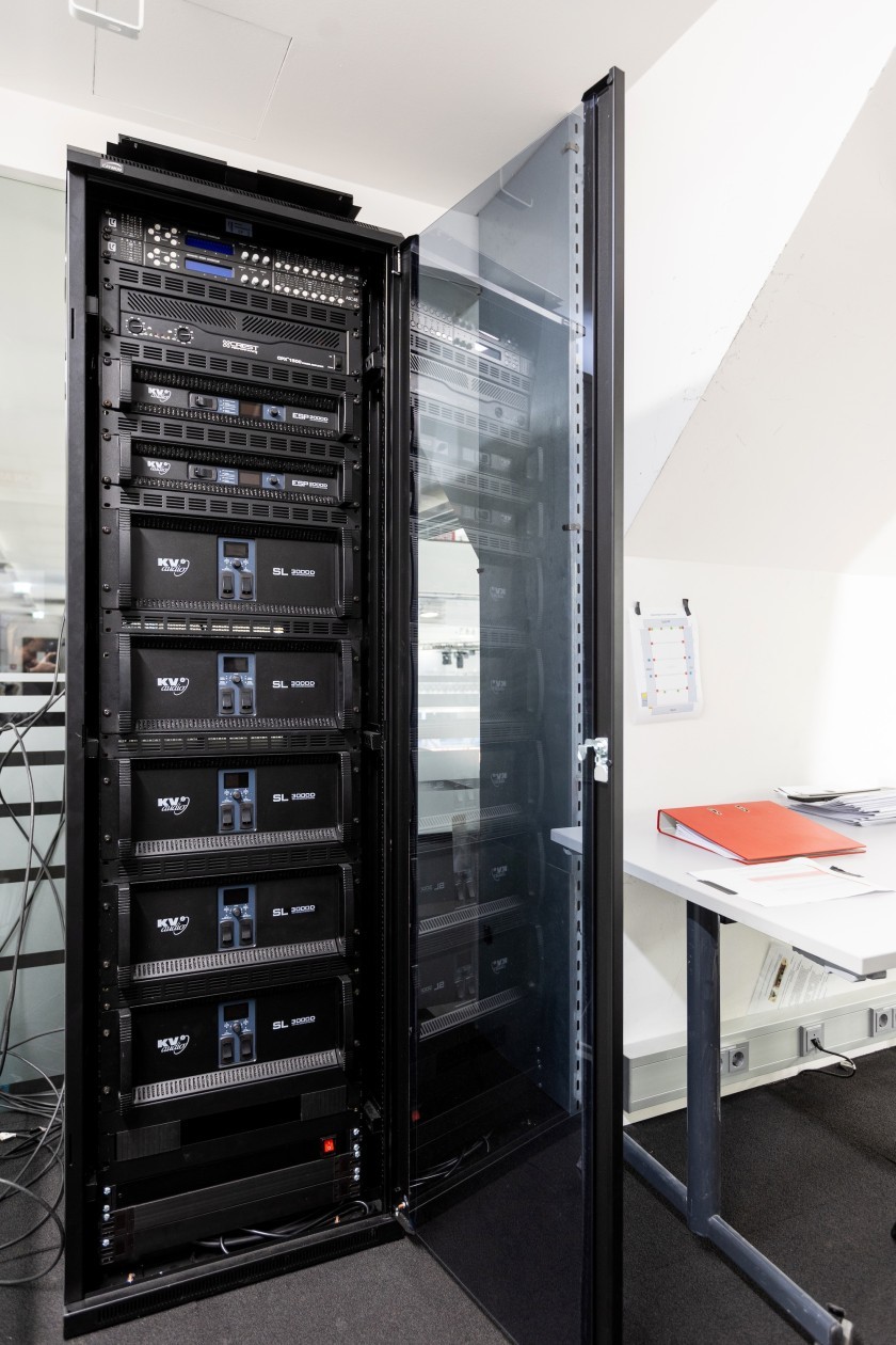 As expected for a venue of this type, a strong resonance was observed around 160–180 Hz. “Instead of increasing overall system levels, we pulled the main loudspeakers out of the full-range mode and attenuated the problematic frequencies directly via EQ,” says Niedermeier. “Even under these constraints, the system still delivers a focused +3 dB of punch at 70 Hz – ensuring that music cues and stingers remain impactful, while vocal clarity stays intact.” Signal distribution is run over redundant Dante (primary/Secondary) via Netgear AV-Line switches with analog fallback, managed by Linea Research ASC48 processors. FOH operation and monitoring are handled by a Yamaha QL1 using a custom-built control interface.