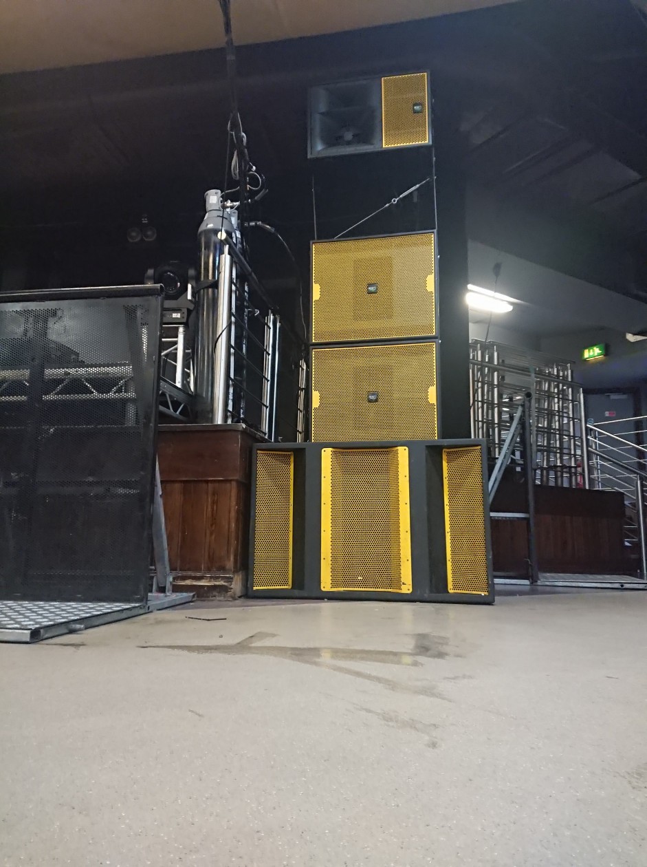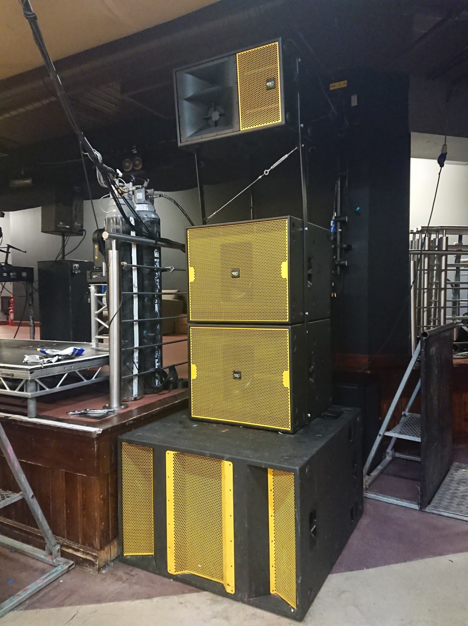 After discussion with KV2 and MRL productions, it was decided that despite being rather tired after 13 years’ service and much (mis)handling by lots of student ‘technical’ crew, the original system was still in remarkably good condition; rather than consign it to the scrap heap it was sent back to the factory for a complete refurbishment including a sharp new bright yellow paint finish. Several new elements were added to the system which now comprises one ES1.0 3-way, high output mid/hi module, two ES2.6 double 15-inch subs and one VHD2.21 ultra-low frequency sub per side in a L/R configuration either side of the stage plus a further two ES1.0s and two EX12 full range active loudspeakers that are flown. The system is driven by four EPAK2500R amplifiers and two VHD3200 amps for the new VHD double 21” subwoofers, with processing via an NST Audio D48S.